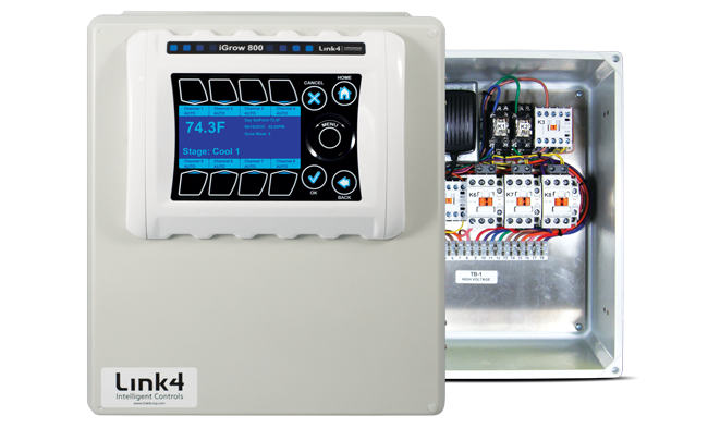 Fullbloom offers the iGrow 800 automation controller with an integrated contact panel. This pre-wired panel and controller gives you everything you need to hook up your electronic accessories to run an automated system. The panel comes with 22 amp contacts pre-wired to each channel on the controller, meaning all your electrician has to do is wire up the individual accessories and you will be up and running in no time. You can get these integrated controllers with 8 or 12 channels so you can scale to the size of operation.